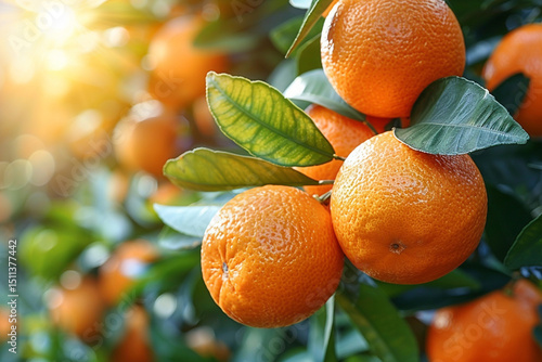 Ripe citrus oranges adorn the leafy branches of a healthy orchard tree, a fresh and natural crop ready for juice