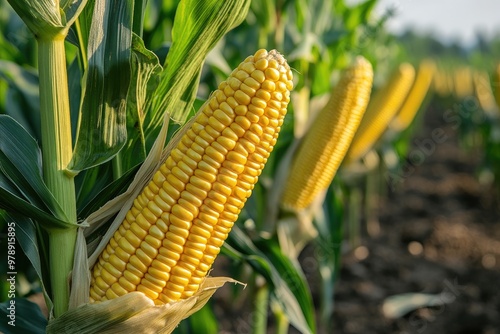 Ripe corn cob growing in agricultural field is waiting for harvest