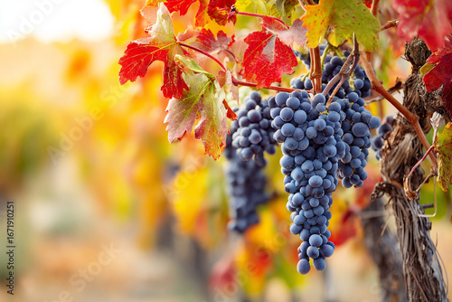 Ripe dark grapes hanging on a vine with autumn leaves in a vineyard