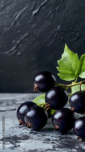 Ripe glossy blackcurrants on a branch with a fresh green leaf.
