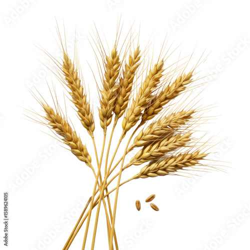 ripe golden wheat ears with distinct plump grains and delicate awns, isolated on a transparent studio background with even lighting and no shadows, creating a floating appearance. Concept of natural