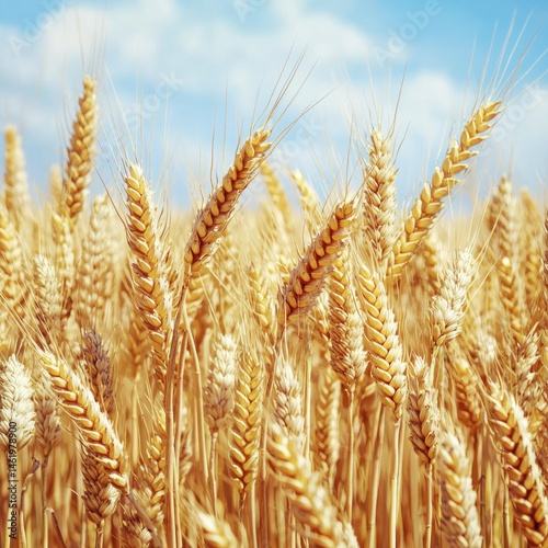 wheat, field, grain, agriculture, harvest, crop, cereal, sky, blue, summer, farmland, nature, plant, food, gold, rural, landscape, season, growth, farming, countryside, ripe, sunny, yellow, outdoors, closeup, meadow, wheatfield, healthy, background, barley, rye, seed, stem, grass, cultivated, sunlight, ear, sky background, detail, natural
