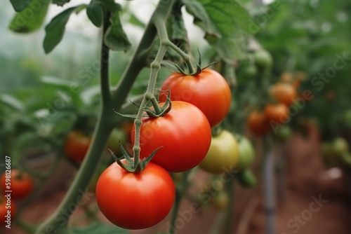 Ripe juicy tomatoes in a greenhouse, Generative AI