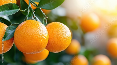Ripe mandarin oranges hanging from a branch in a sunlit organic garden during a warm afternoon