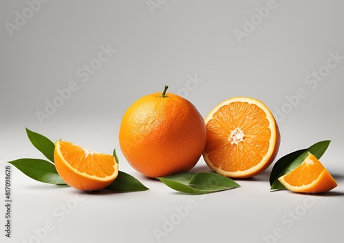 Ripe orange fruit. Whole, half and sliced ​​with leaves isolated on white light