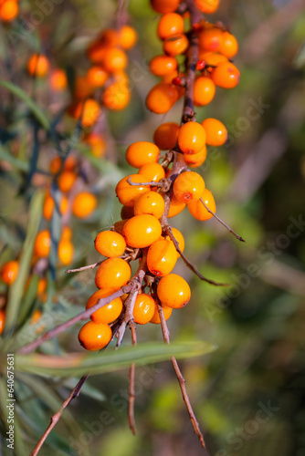 Ripe orange-yellow berries of the wild sea buckthorn on branch close-up in selective focus.