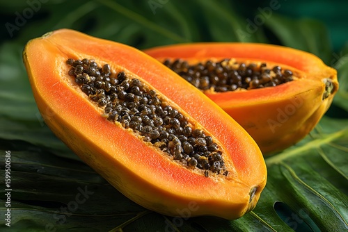 Ripe Papaya Halves with Seeds on Green Tropical Leaves, Closeup Still Life