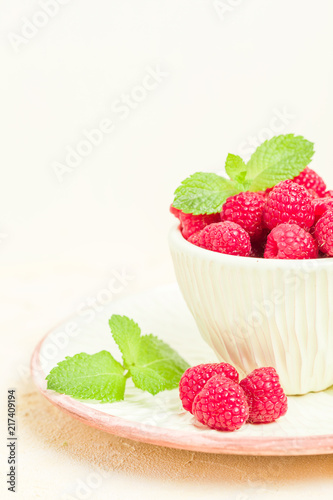 Ripe raspberries with green mint leaves in cup and saucer on pastel yellow background.