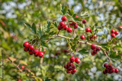 Ripe red berries on the branch of a hawthorn tree