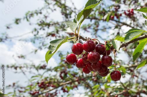 Ripe red cherries on a green branch against the sky. Phone screensaver, summer fruits.