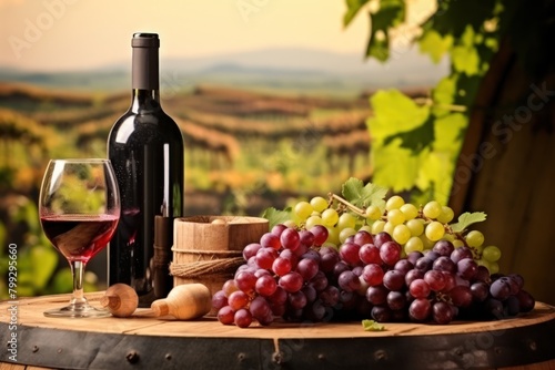 Ripe red grapes and a bottle of wine with poured glasses stands on a wooden barrel. Exquisite taste wine for your romantic evening.