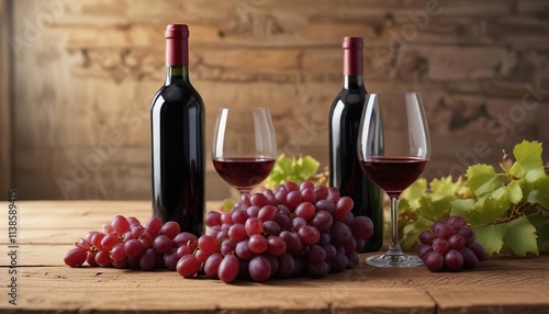 Ripe red grapes and wine bottle with a clear glass placed on a simple wooden table, vineyard, foodie, rustic