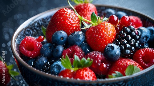 Ripe red strawberries and juicy blueberries in white bowl, perfect summer healthy treat
