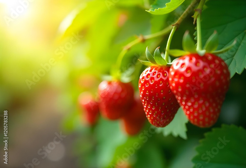 Ripe red strawberries hanging from green leafy plants, with a soft, blurred background and sunny garden setting