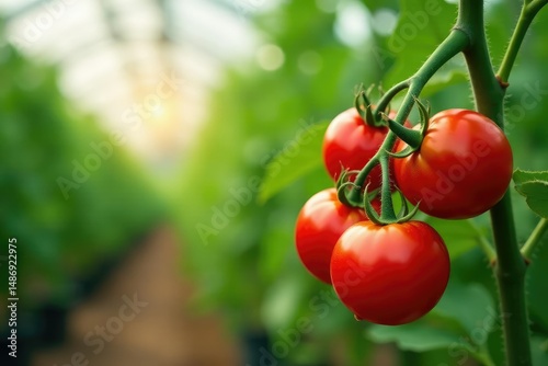 Ripe red tomatoes growing on vine in greenhouse , healthy, red tomatoes, leaf