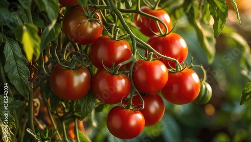 Ripe tomato plant thriving in greenhouse. Delicious red tomatoes. Out-of-focus background and blank space.