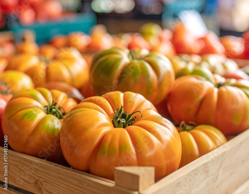 tomatoes, fresh, ripe, vegetable, produce, market, wooden, crate, healthy, food, organic, freshness, favor, vibrant, colours, orange, yellow, green, closeup, close, display, health food, nature, farming, gardening, market stall, abundance, quality, food photography, natural