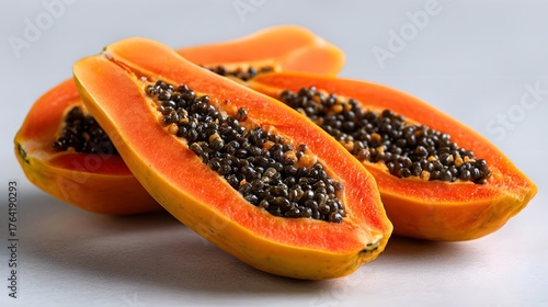 Ripe tropical fruit halves displaying vibrant orange flesh and numerous black seeds are arranged on a light surface
