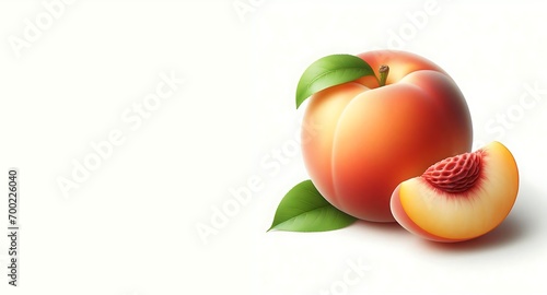 Ripe whole peach fruit with green leaf and slice isolated on white background, generative ai