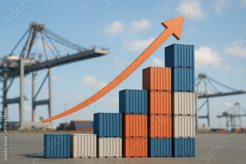 Rising Cargo: A visual representation of upward trending export in the logistics industry. Colorful shipping containers stacked and the orange arrow create a bold statement of rising export.