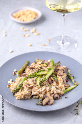 risotto, rice, serving, mushroom, champignon, asparagus, wine, pine, tasty, fresh, summer, eatery, cooking, cookbook, concrete, facility, table, plate, grey, glasses, flatware, dish, food, dinner, fish, epicure, shrimp, healthy, italian, delicious, meal, sea, seafood, mediterranean sea, receipe, rice, shrimp, traditional, scampi, cheese