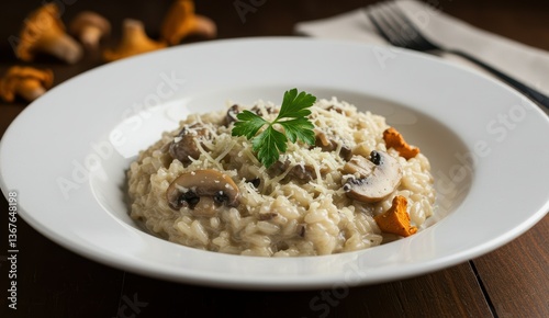 risotto, mushroom, italian cuisine, cheese, garnish, plate, wooden table, cooking, meal, food photography, culinary, epicure, savoury, dining, delicious, garnished, creamy, indulgence, eatery, bistro, sustainable, comfort food, gastronomy, culinary arts, elegant, appetising, detailed, texture, kitchen, taste, traditional, hearty
