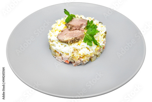 Risotto with pork, egg and vegetables. Isolated over white background