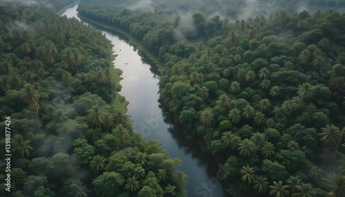 river, flowing, forest, tropical, canopy, aerial, view, landscape, nature, tree, green, dense, fog, travel, scene, water, foliage, growth, vegetation, environment, wildlife, scenic, destination, fresh, clean, background, jungle, palm, daylight, natural, aerial view, humid