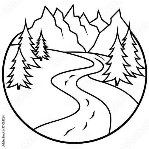 river, forest, outline, colouring, book, page, line, art, drawing, nature, tree, water, landscape, wood, stream, wilderness, plant, scenery, simple, vignetting, black, white, illustration, doodle, design, artwork, minimalist, environment, outdoors, wildlife, natural, foliage, mountain, botanical, serene, tranquil, peaceful, scenic, flow, organic, path, scene, creative