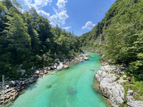 River Soča with surrounding forests during summer and low water level (Kobard, Slovenia) - Fluss Soca mit umliegenden Wäldern im Sommer und bei niedrigem Wasserstand (Slowenien)