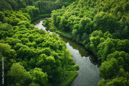 River water flowing through a green forest, showcasing the beauty of nature. Scenic landscape with trees and park, perfect for travel. Aerial view captures the environment in