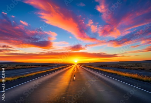 road, highway, sky, travel, asphalt, landscape, sunset, speed, horizon, journey, nature, sun, cloud, way, car, cloud, driving, motion, drive, empty, rural, route, expressway, traffic, grass