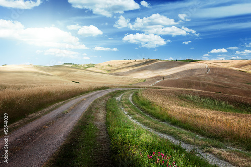 agriculture, blue, country, countryside, cultivated, dirt, dry, dust, empty, europa, farm, farmland, field, grass, gravel, ground, harvest, hay, hill, italy, land, landscape, meadow, morning, mountain, nature, nobody, pastoral, pasture, plant, road, rural, sand, scenery, shadow, sky, summer, tree, tuscany, way, yellow, wheat