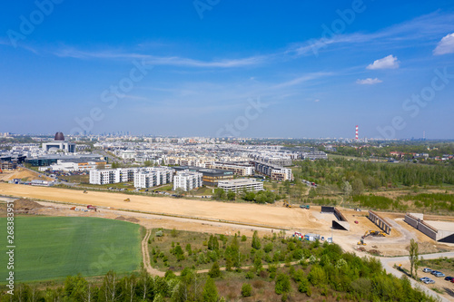 Road construction machinery prepare the ground for the construction of highway. Warsaw. Aerial view