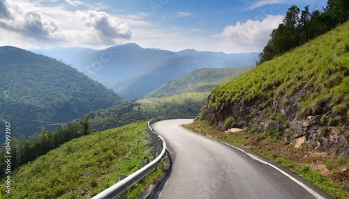 road, mountain, landscape, sky, highway, travel, mountain, nature, asphalt, summer, cloud, way, view, country, grass, hill, forest, car, drive, vale, green, rock, scenery, cloud, curve, journey, empty, park, trip, transportation, presentation, template, resource, photo, wallpaper, background, texture