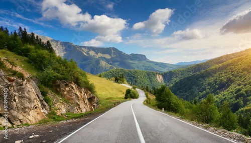 road, mountain, landscape, sky, highway, travel, mountain, nature, asphalt, summer, cloud, way, view, country, grass, hill, forest, car, drive, vale, green, rock, scenery, cloud, curve, journey, empty, park, trip, transportation, presentation, template, resource, photo, wallpaper, background, texture
