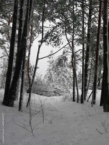 road in winter snowy pine forest, selective focus
