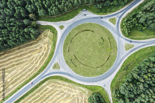 aerial, roundabout, road, intersection, rural, landscape, countryside, car, traffic, drive, junction, transport, summer, green, grass, tree, forest, wood, foliage, field, transportation, travel, round, circle, vehicle, asphalt, scenic, nature, natural, route, way, background, day, flying, drone, topview, up high