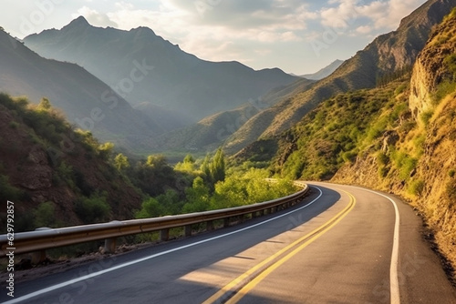 road, mountain, landscape, highway, travel, sky, nature, asphalt, mountain, summer, cloud, way, car, drive, trip, view, hill, journey, green, curve, winding, route, vale, empty, forest