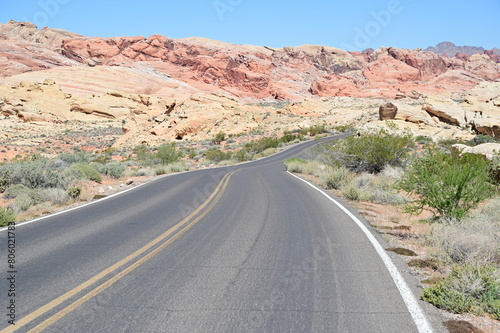 Road running through The Valley of Fire state park on a scorching April day in 2024.
