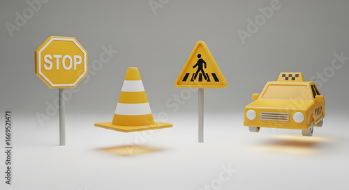 Road safety elements with stop sign, traffic cone, pedestrian sign and taxi