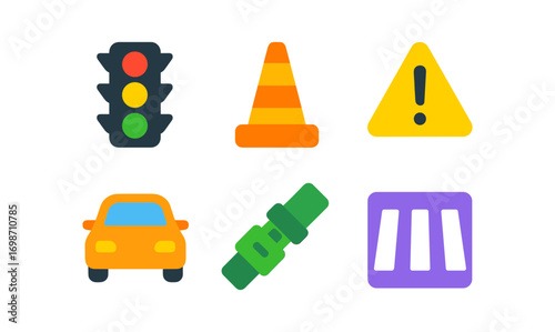 road, safety, icon, traffic, warning, signs, symbol, set, educational, design, light, cone, exclamation, attention, vehicle, car, belt, seatbelt, pedestrian, crosswalk, signal, alert, highway, transportation, drive, caution, hazard, prevent, secure, colourful, simple, graphic, flat, transport, journey, map, path, protect, urban, travel, arrangement