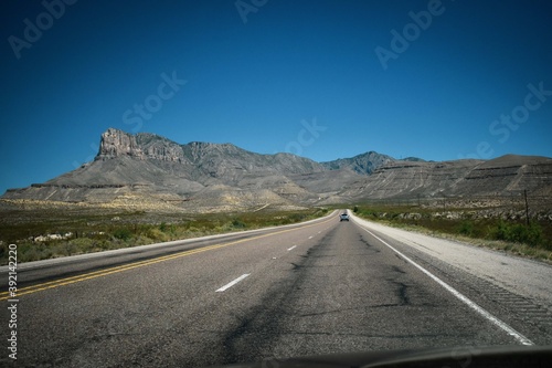 road, highway, mountain, landscape, travel, sky, asphalt, desert, nature, mountain, scenic, blue, trip, line, nobody, outdoors, us, cloud, route, street, transportation, way, texas, park, national park