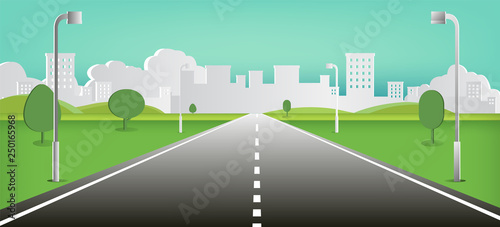 Road to nature backgroud vector illustration.Street with field , hills , clouds , trees in Paper style vector illustration.Beautiful nature landscape.Cityscape scene.Green street to town.