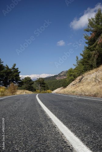 road, highway, asphalt, sky, travel, landscape, way, nature, drive, rural, empty, line, street, transportation, country, mountain, long, curve, summer, tree, journey, horizon, transport, countryside, cloud
