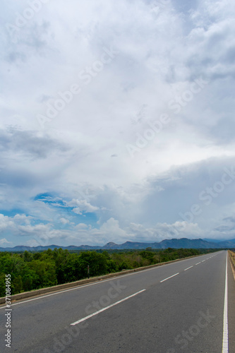 road, highway, sky, landscape, asphalt, travel, cloud, nature, blue, cloud, way, horizon, summer, green, field, line, journey, grass, street, transportation, car, rural, countryside, country, straight