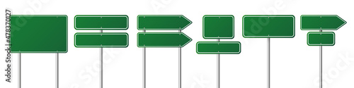 Road traffic signs set. Blank board with place for text. Mockup. Isolated green information sign. Direction. Vector illustration.