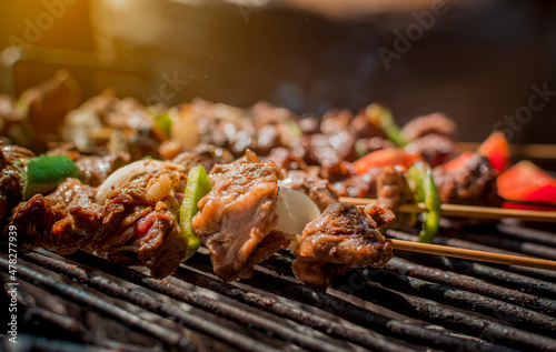 Roast beef skewers on a grill, Roast beef skewers grilling on a grill, Roast beef concept