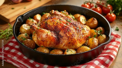 chicken, roast, dinner, rustic, potato, comfort food, culinary, savoury, roasted, receipe, home cooking, epicure, gold, baked, hearty, crispy, herb, vegetable, traditional, delicious, glazed, homemade, kitchen, poultry, meat, cookery, main course, cooked, seasoned, marinade, green onion, festive, flavorful