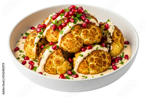 Roasted cauliflower with tahini sauce and pomegranate seeds isolated on transparent background
